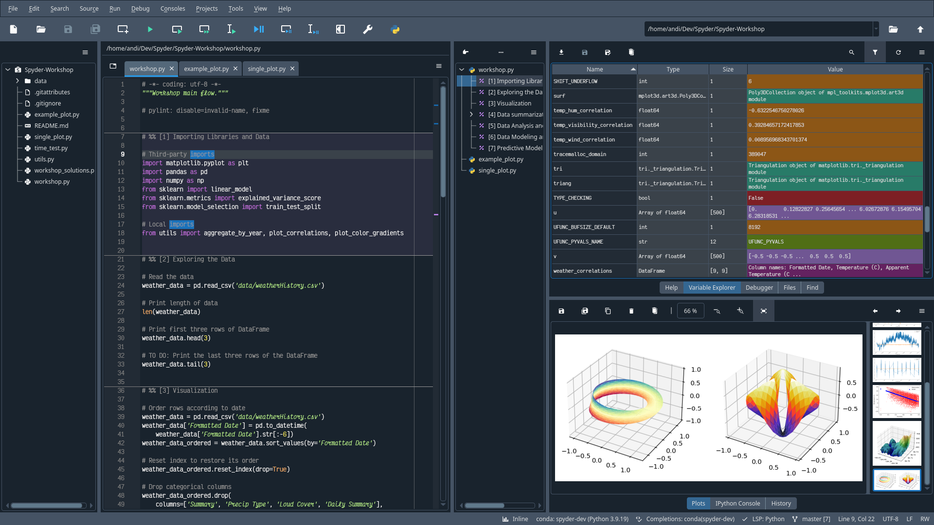 Data analysts, scientists and engineers require a lot of experimentation, quick feedback and short iteration cycles while programming. Spyder was built from the ground up around that workflow.