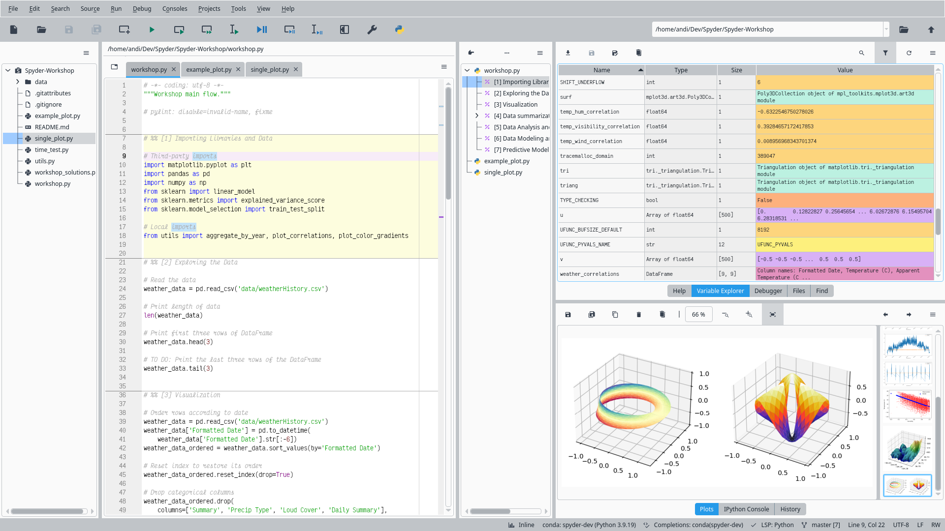 The software you write is critical for new scientific discoveries and engineering solutions. Spyder helps you move from single scripts to structured, reusable modules and packages without losing interactivity. It also includes powerful software development tools whenever you're ready for them.